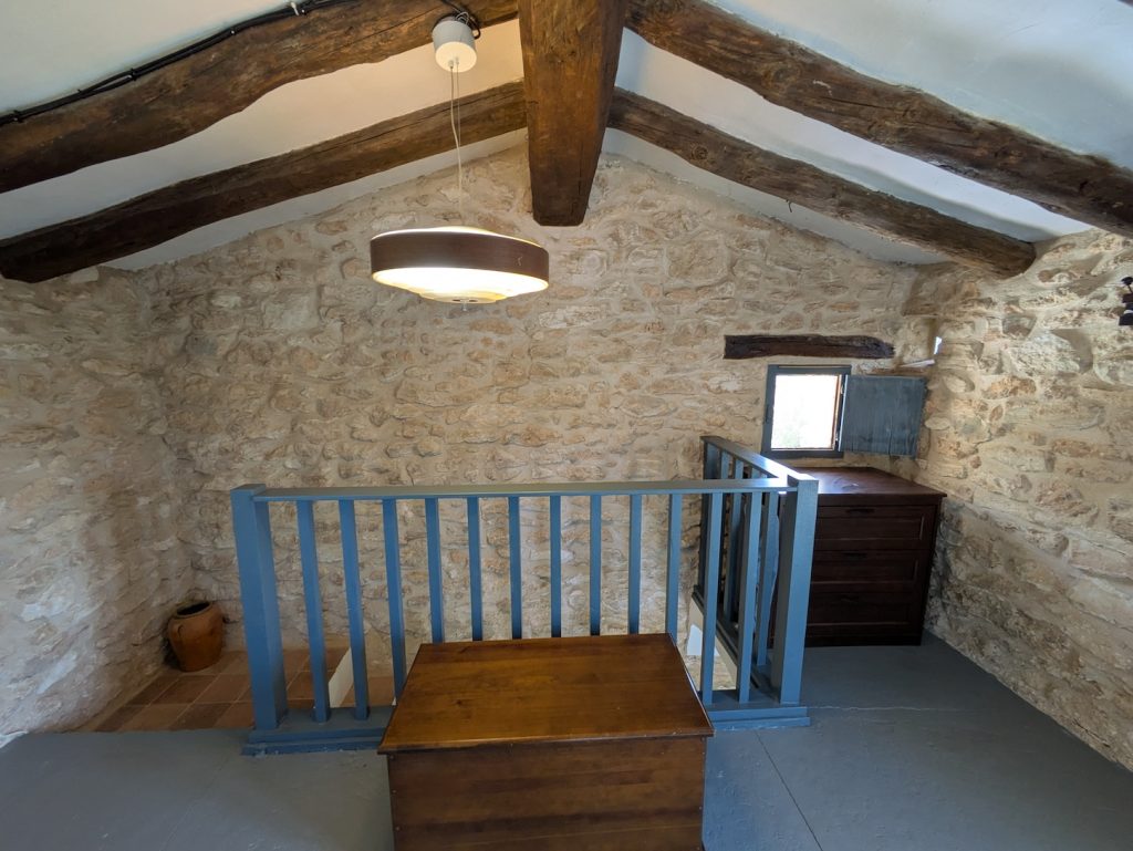 The main bedroom keeps its original character with thick stone walls, timber beams and windows facing all four directions. A balcony on the south side looks out across open valleys and sky. An ensuite shower room completes the space.